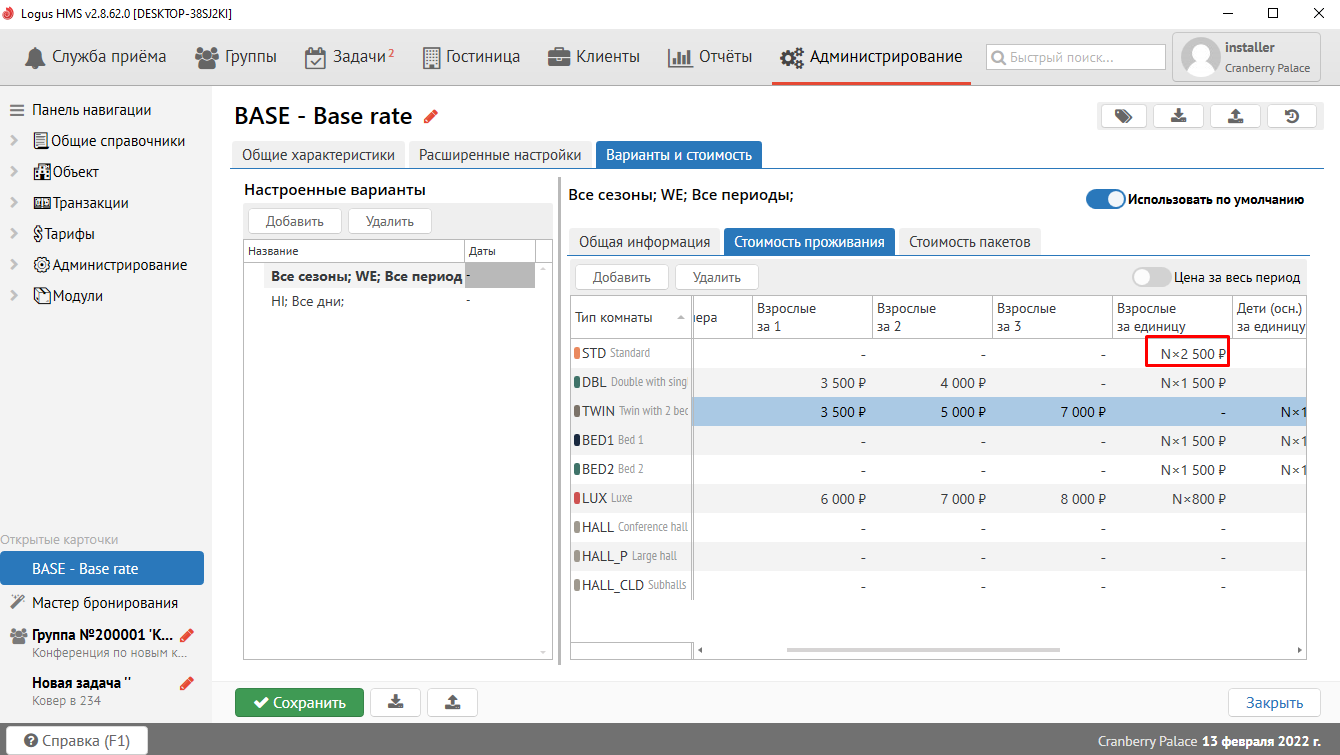 3. В настройке тарифа устанавливаем флаг на необходимый сезон и настраиваем стоимость проживания: