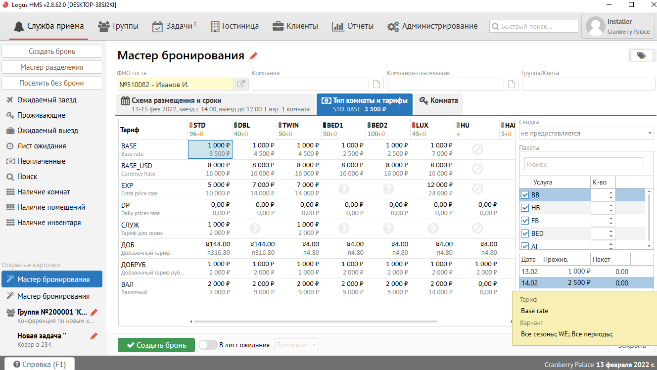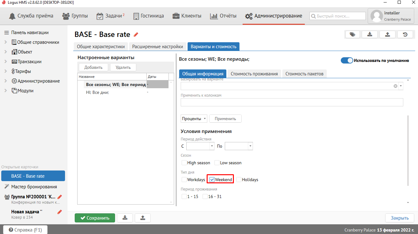 Таким образом, при заведении брони стоимость проживания меняется, согласно выбранному типу дня.  Справа, при наведении на стоимость проживания отображается информация, откуда подтягивается данная стоимость: